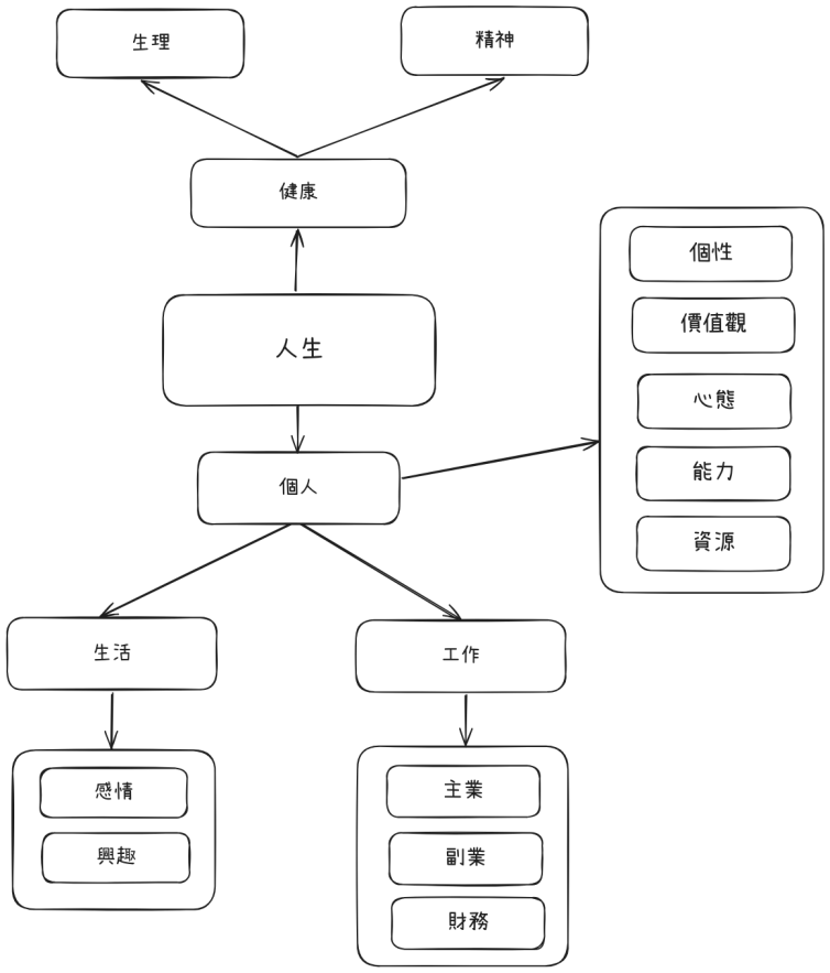 「個人」則包含 個人發展(圖中的個性、價值觀那些)、生活 和 工作 三個子領域。三者中 個人發展 為先,「工作」和「生活」並列。